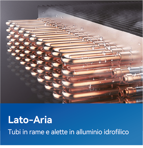 Lo scambiatore di calore lato aria utilizza tubi in rame ad alta efficienza e alette in alluminio con trattamento idrofilico.